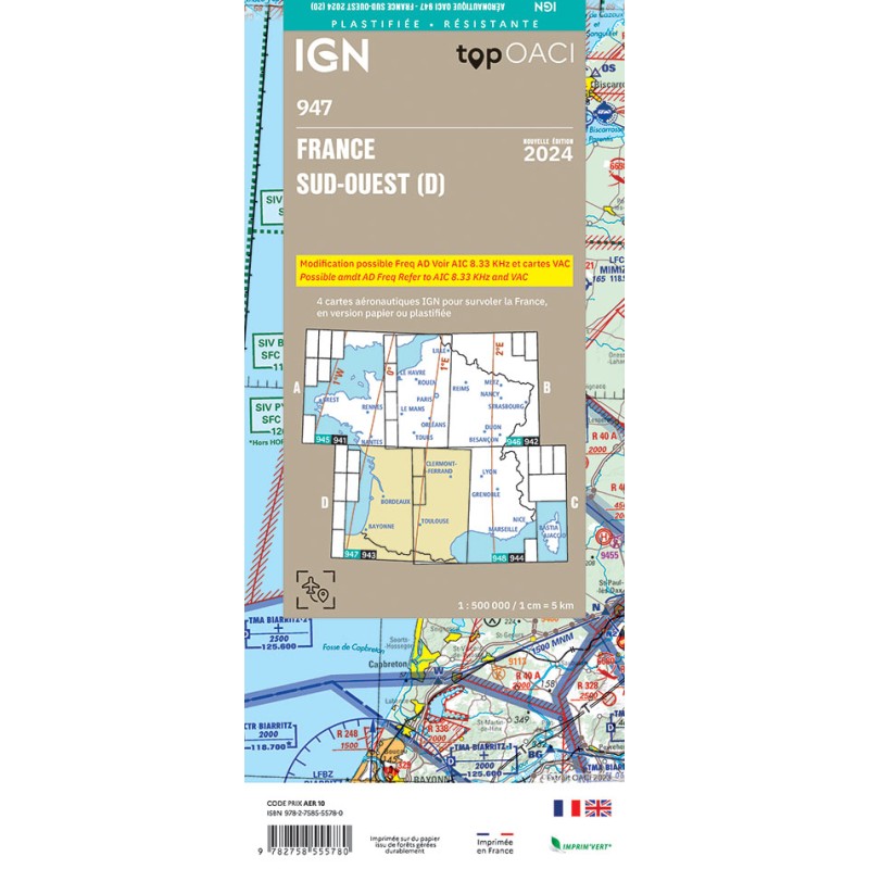 La carte aéronautique OACI (Organisation de l’aviation civile internationale) est éditée et produite chaque année par l’IGN, en étroite collaboration avec le Service de l’information aéronautique (SIA). Elle est conçue pour le vol à vue. Son échelle est de 1/500 000 (1cm=5km). La couverture du territoire métropolitain est assuré par 4 cartes